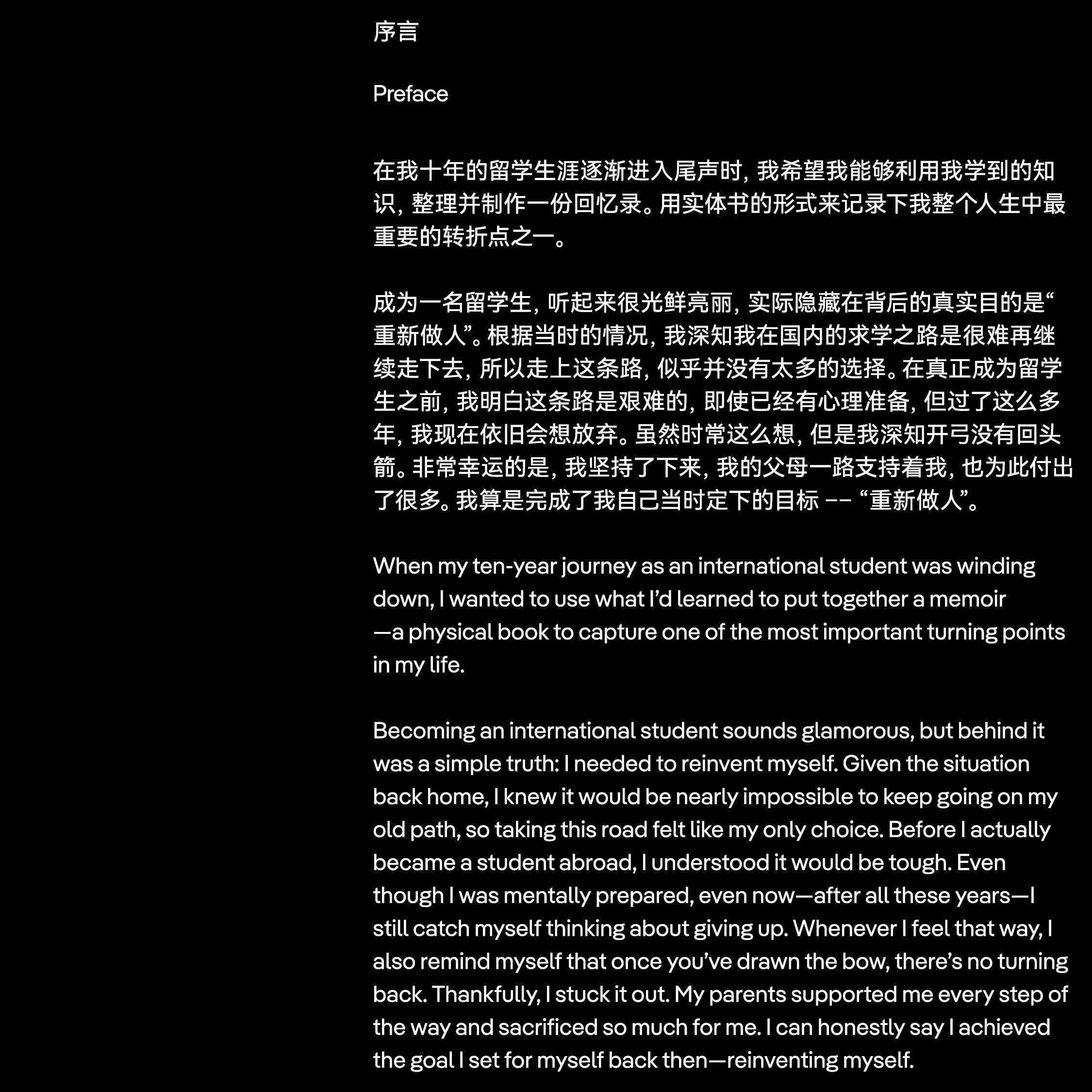 Starting Over is a bilingual memoir tracing a decade-long journey of studying abroad, shaped by loneliness, cultural tension, and quiet resilience. Through cities, seasons, and sleepless nights, the author reflects on the emotional cost of growing up far from home—navigating distance, family pressure, and the shifting sense of identity. With honest glimpses into grief, humor, heartbreak, and hope, the book invites readers into the inner world of someone trying to make sense of who they are in places that never fully feel like home. Each chapter is marked by a flight ticket and unfolds like a memory in motion.